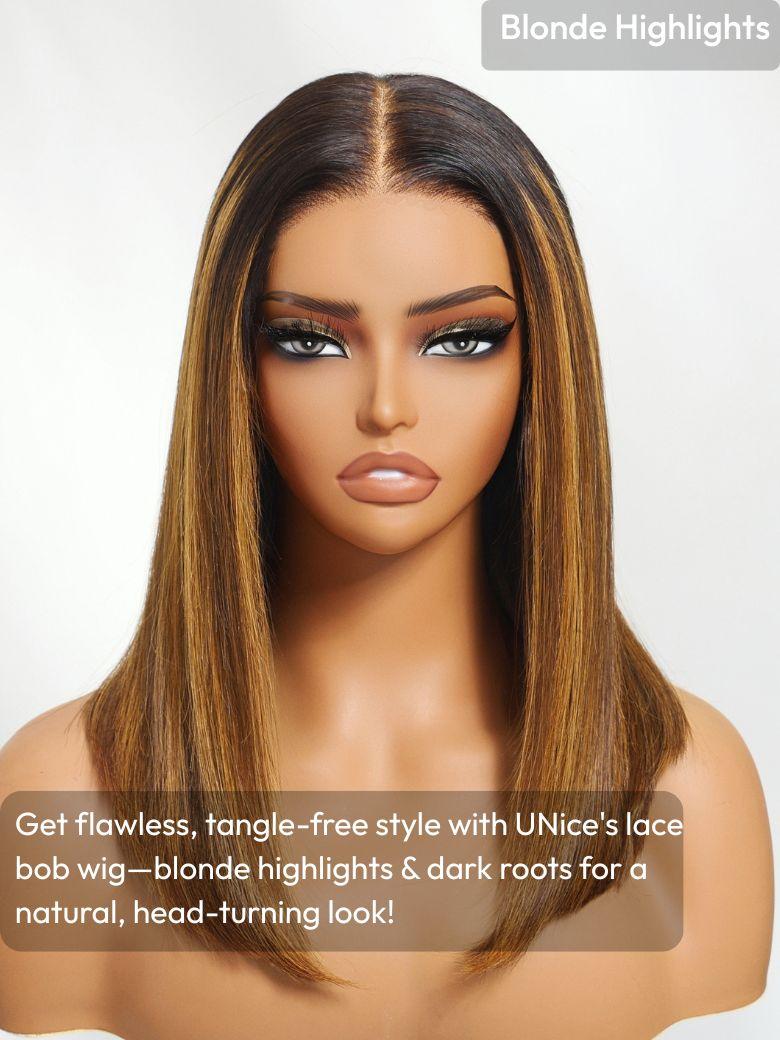 UNice Bye-Bye Knots 7x5 Lace Brown With Blonde Piano Highlights Blunt Bob Wig with Dark Roots