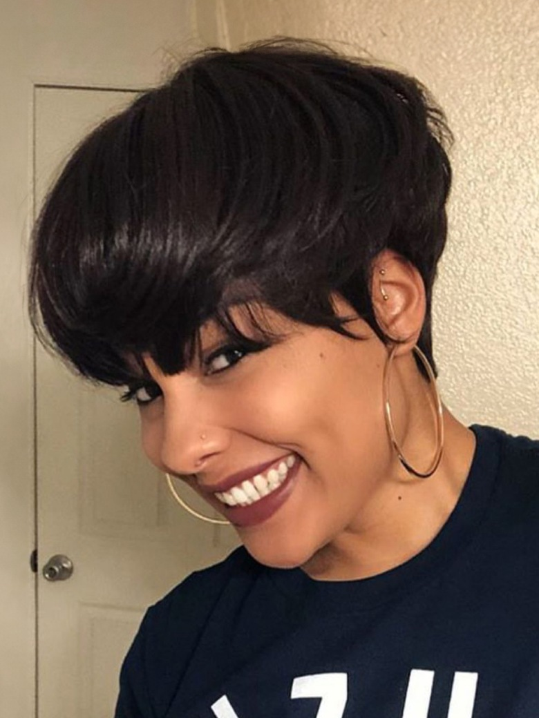 - Short pixie cut with a sleek side bang