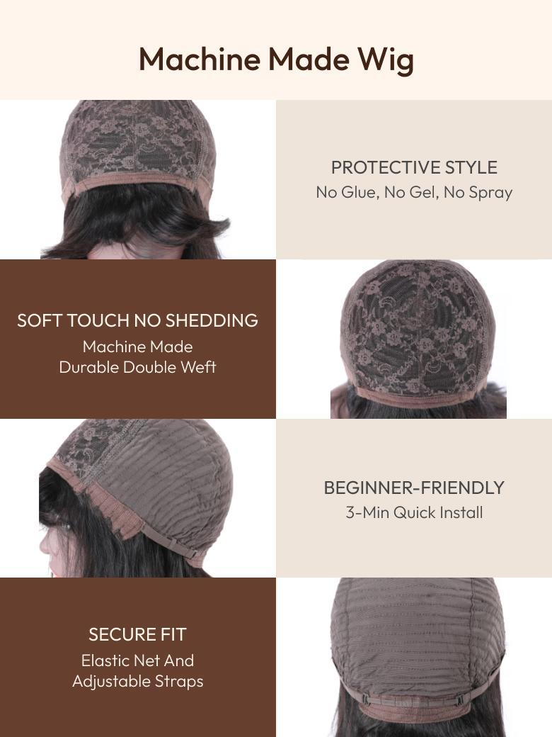 UNice Machine Made Yaki Human Hair Glueless Curtain Bangs Wig & Bye-Bye Knots 7x5 Lace Frontal Pull And Go Fluffy Natural Black Loose Wave Wig