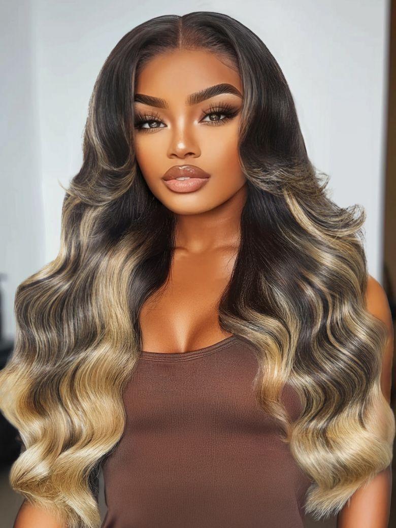 UNice Bye-Bye Knots™ Black With Blonde Highlights 7x5 Lace Loose Wave Wig With Face Framing Layers