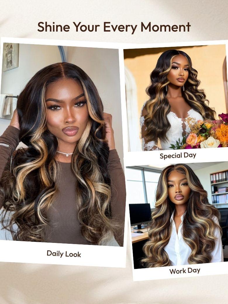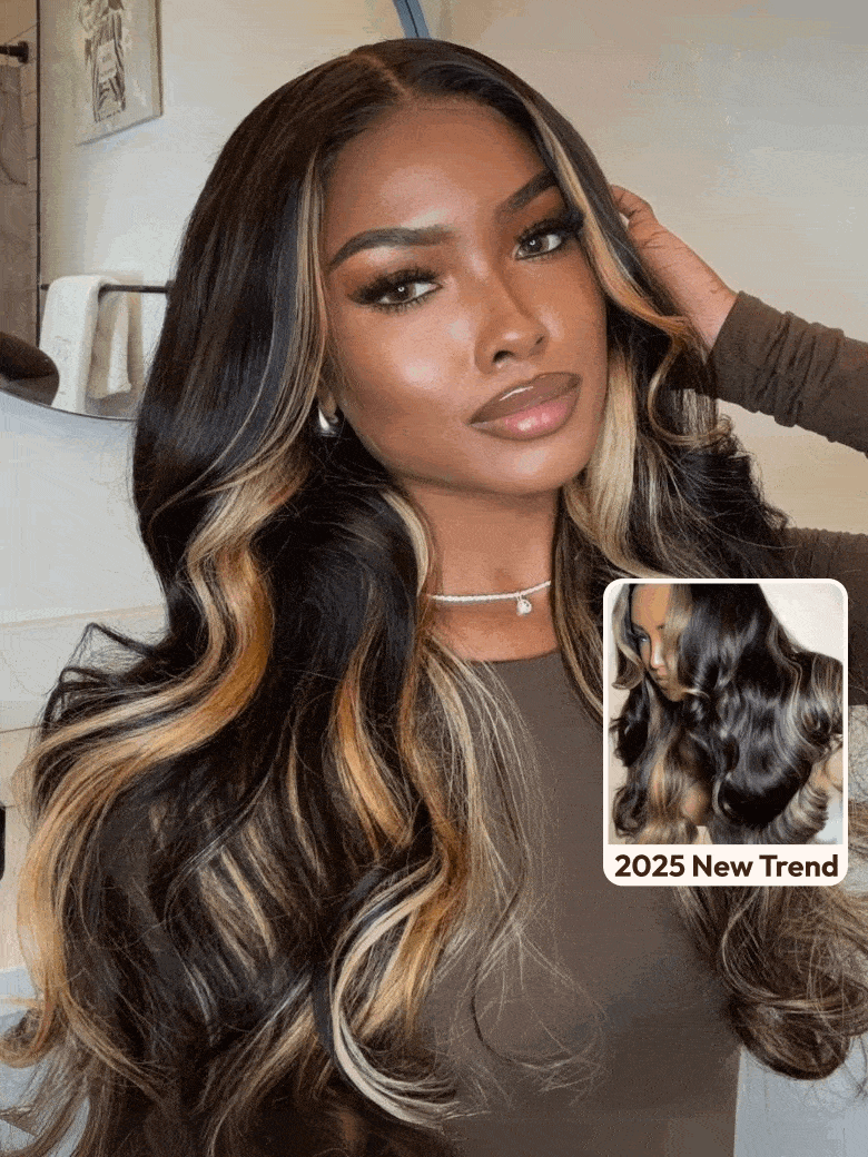 - Butterscotch blonde highlighs -- blend mimics salon color while honoring real texture.