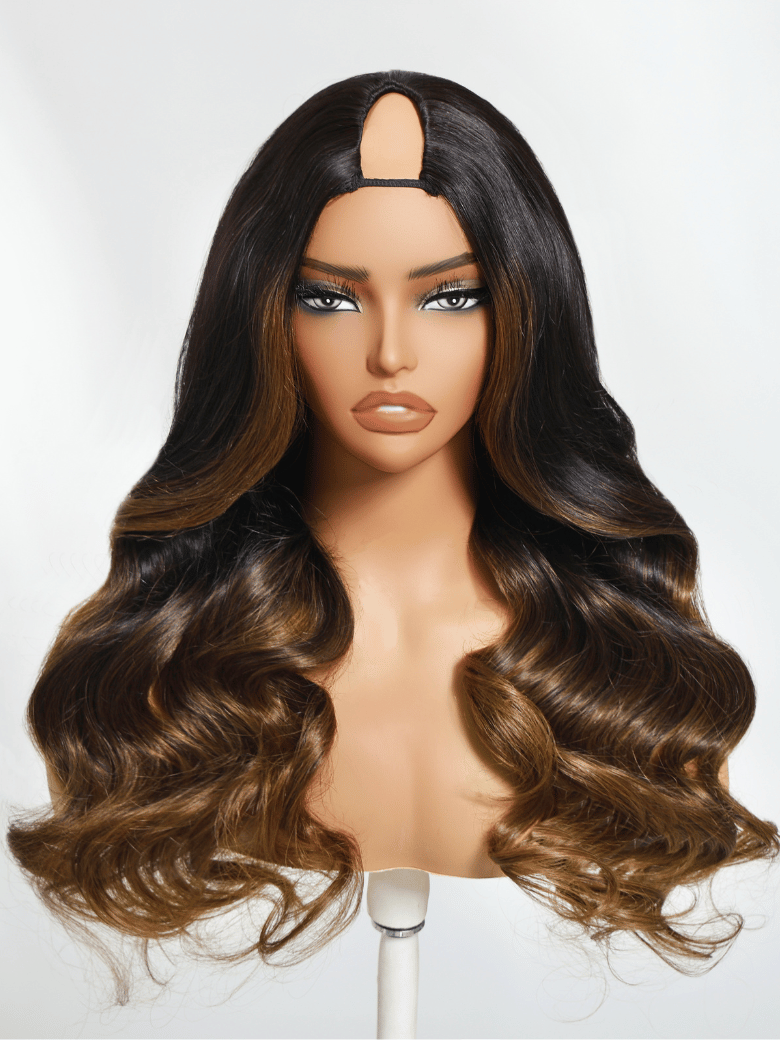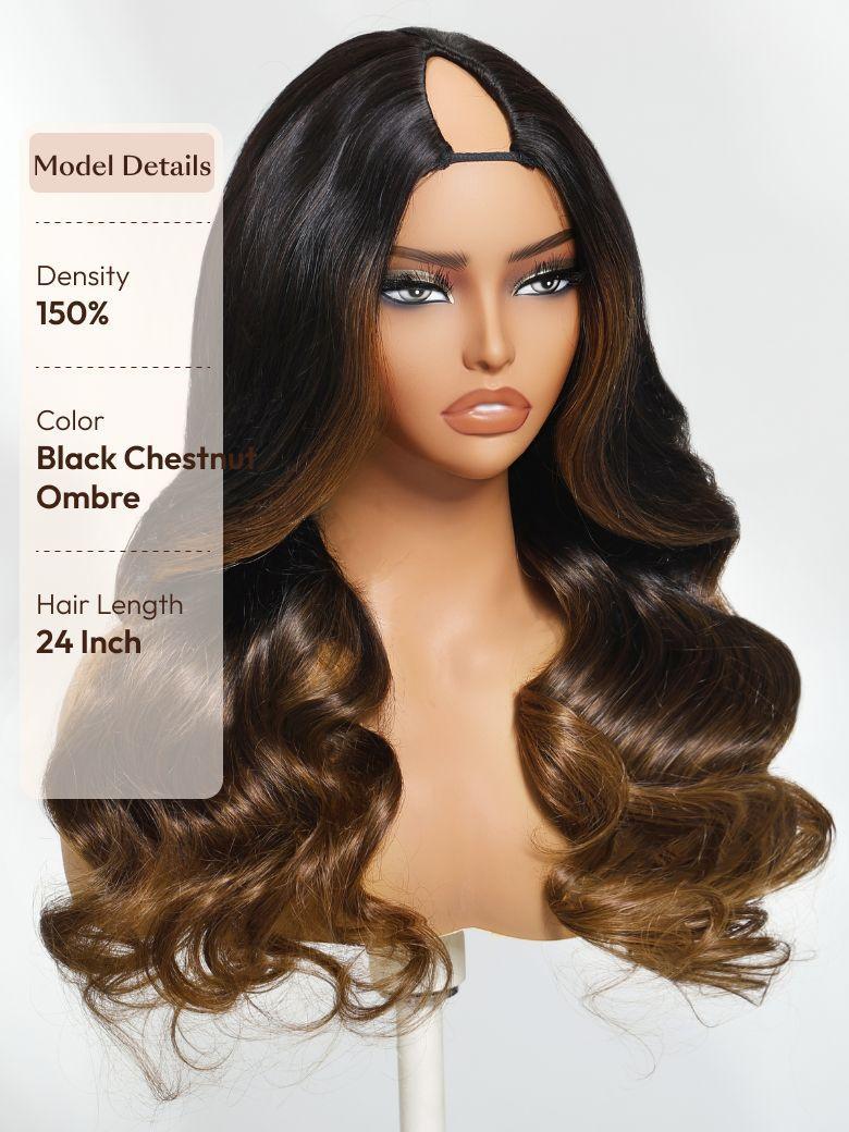 UNice EasiContour™ V Part Black to Chestnut Brown Ombre Body Wave Wig With Invisi Drawstring
