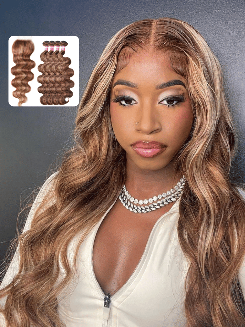 UNice Honey Blonde Piano Highlighted Body Wave 4Pcs Bundles With Closure